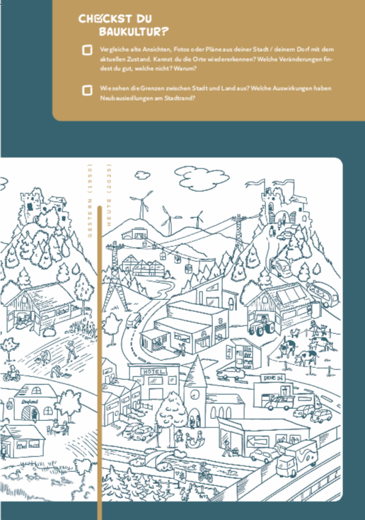 Das Aktivitätsbuch „Checkst du Baukultur?“ ermöglicht in 12 Themen die aktive Auseinandersetzung mit Themen der Baukultur.