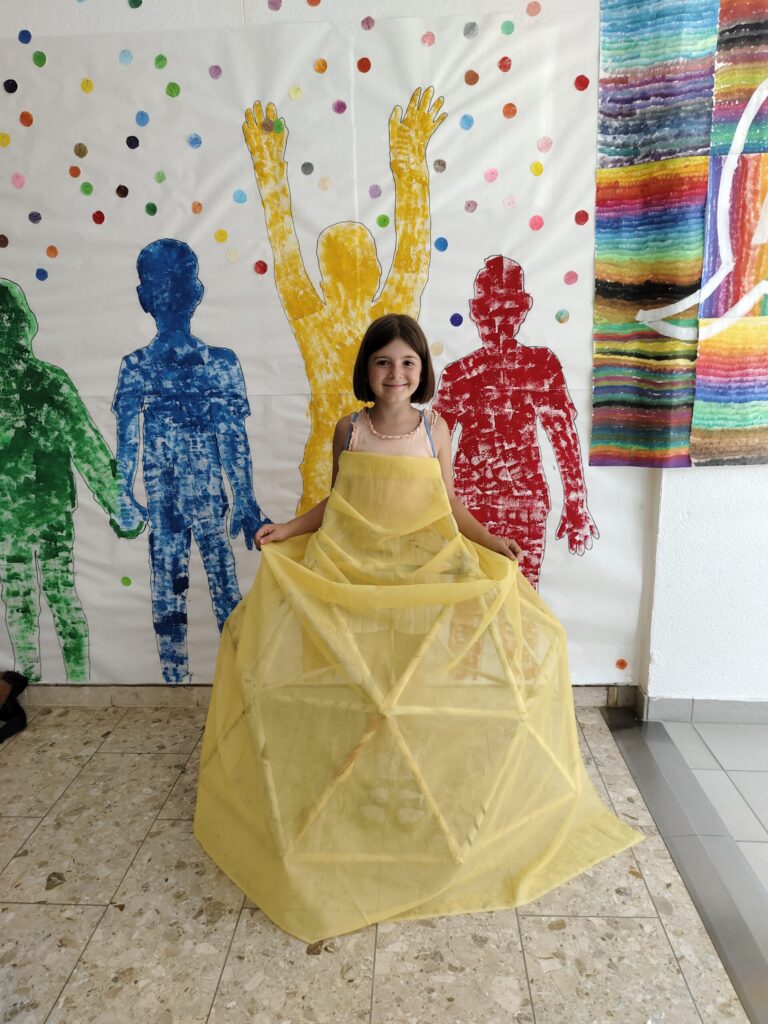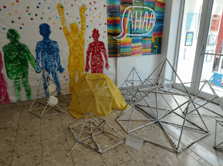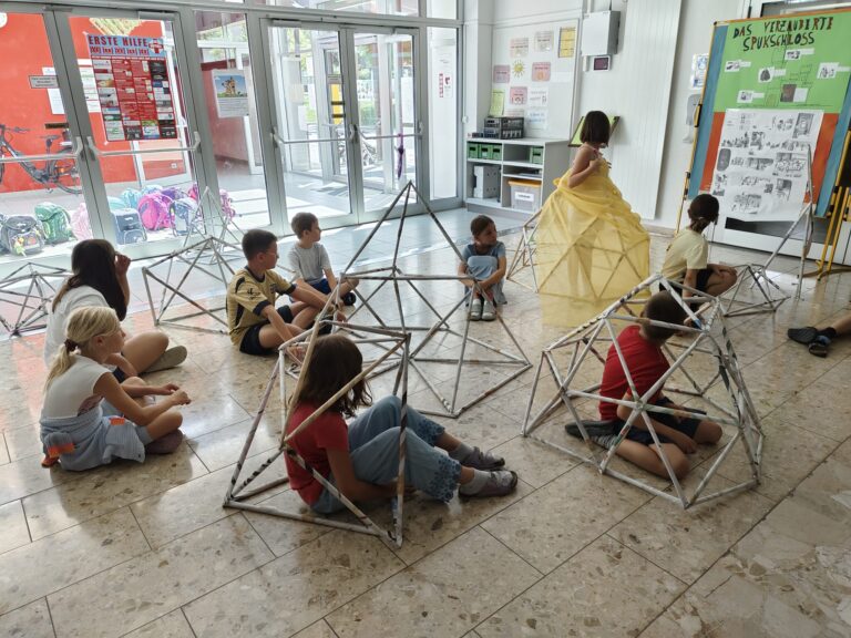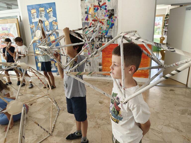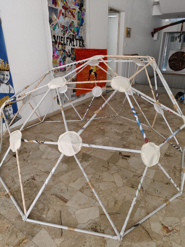 Die Kinder engagieren sich aktiv und kreativ: Sie rollen, falten, kleben und bauen aus Zeitungen verschiedene Strukturen wie Türme, Brücken, Kuppeln oder Riesenräder. Dieser praktische Ansatz fördert die Feinmotorik und Ausdauer sowie das räumliches Vorstellungsvermögen und dreidimensionale Denken. Die Schüler:innen lernen, präzise mit Materialien umzugehen und ihre Handfertigkeiten zu verfeinern. Diese komplexeren Konstruktionen erfordern eine enge Zusammenarbeit, bei der die Kinder ihre Teamfähigkeit, Kommunikationsfähigkeiten und Entscheidungsprozesse stärken. Die Schüler:innen nähern sich spielerisch und auf eine experimentelle Weise den komplexen Konzepten der Architektur und Geometrie. Dieses interaktive und forschende Arbeiten ermöglicht den Kindern nicht nur eine fundierte Auseinandersetzung mit physikalischen und mathematischen Prinzipien, sondern stärkt auch ihre Problemlösungsfähigkeiten und ihr kreatives Denken.